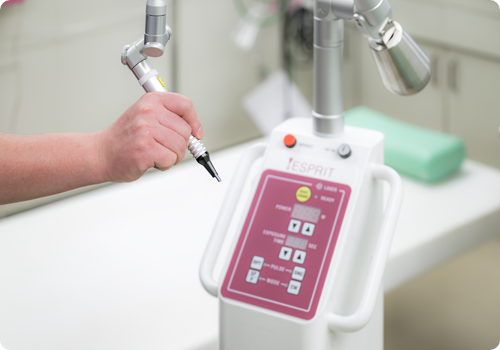 いぼに対して使用するレーザーです。水分に反応するレーザーで、盛り上がった組織を蒸散(除去)することができます。レーザーを当てた部分は皮膚びらんや皮膚潰瘍(きず)になります。創傷被覆材(傷口を覆って保護する医療用のドレッシング材)を貼付することにより通常7日~4週間ほどで皮膚が再生を図ります。治療後の痕は必ず残りますが、周囲の組織へのダメージは比較的少ないとされており、削る深さや部位にもよりますが、時間の経過とともに目立ちにくくなる場合が多いとされています。上皮化した後に黒ずみ(色素沈着)や色が抜ける(色素脱失)、瘢痕、盛り上がって治ったり(肥厚性瘢痕)、へこんで治ったり(萎縮性瘢痕)することがあります。効果や痕の残り方には個人差があります。